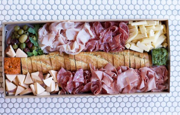 Our charcuterie platter includes our most popular sliced deli meats: mild sopressa, hot sopressa, mortadella, porchetta, ham, turkey, and crackers